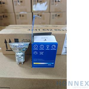 Delivering a warm, halogen-like accent beam, MASTER VALUE is a perfect fit for spot lighting. Thanks to its high CRI, it realizes more natural colors, creating cozy and comfortable ambiences for residential and hospitality projects, and emphasizing the beauty of merchandise in retail. These LED spots MV GU10 have the familiar look and feel of spot lamps, keeping the classic beauty of glass spots and adding the strong performance of LED technology. The dimming function enables you to create the atmosphere you desire, and it works with broad selection of dimmers. MASTER VALUE also offers more energy savings that normal LED spots.